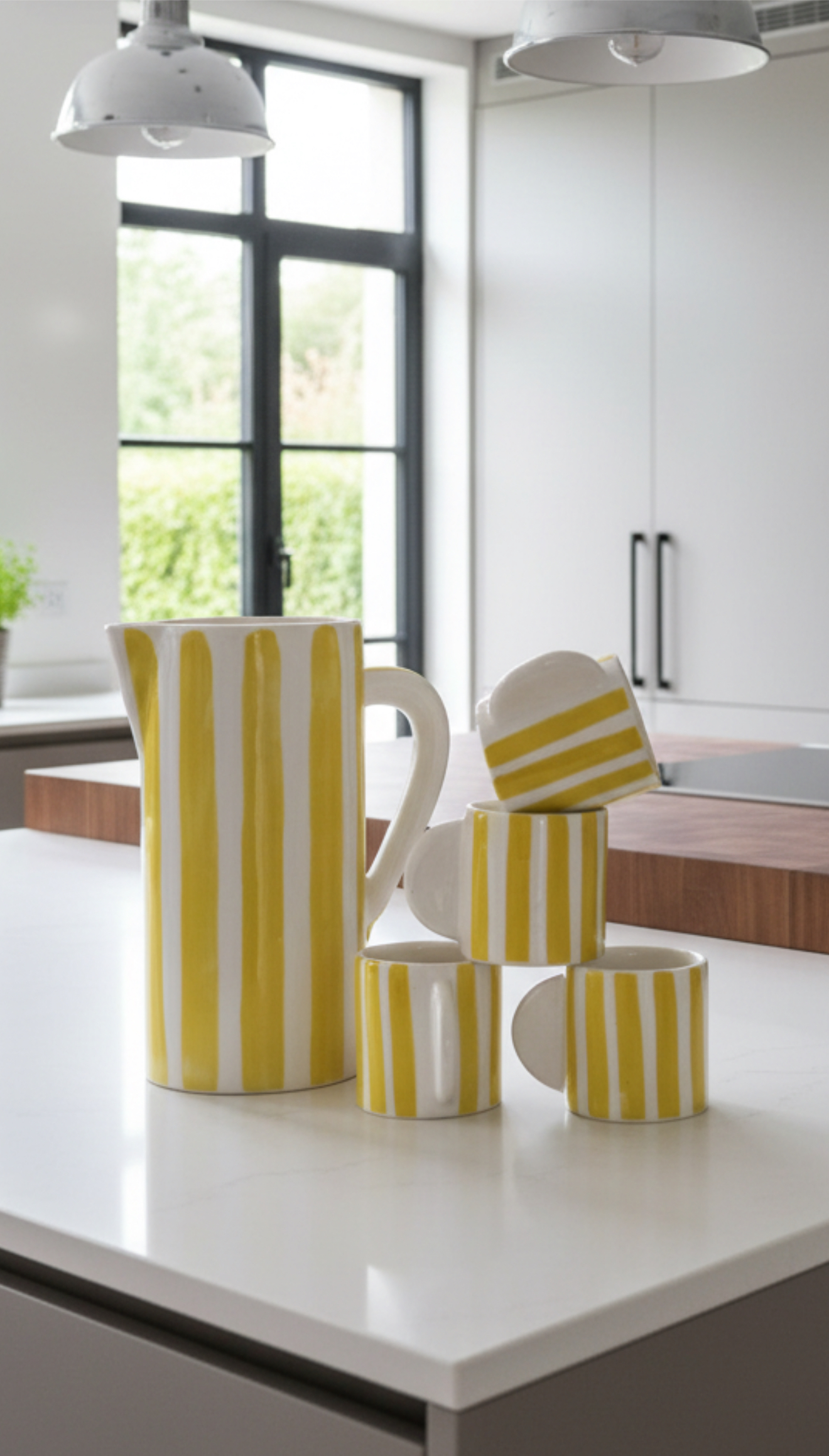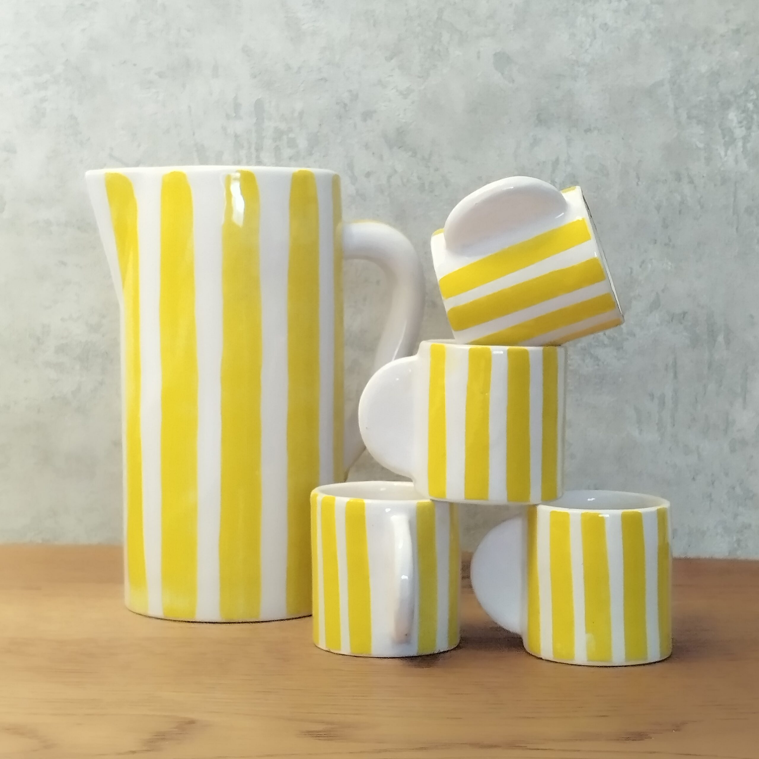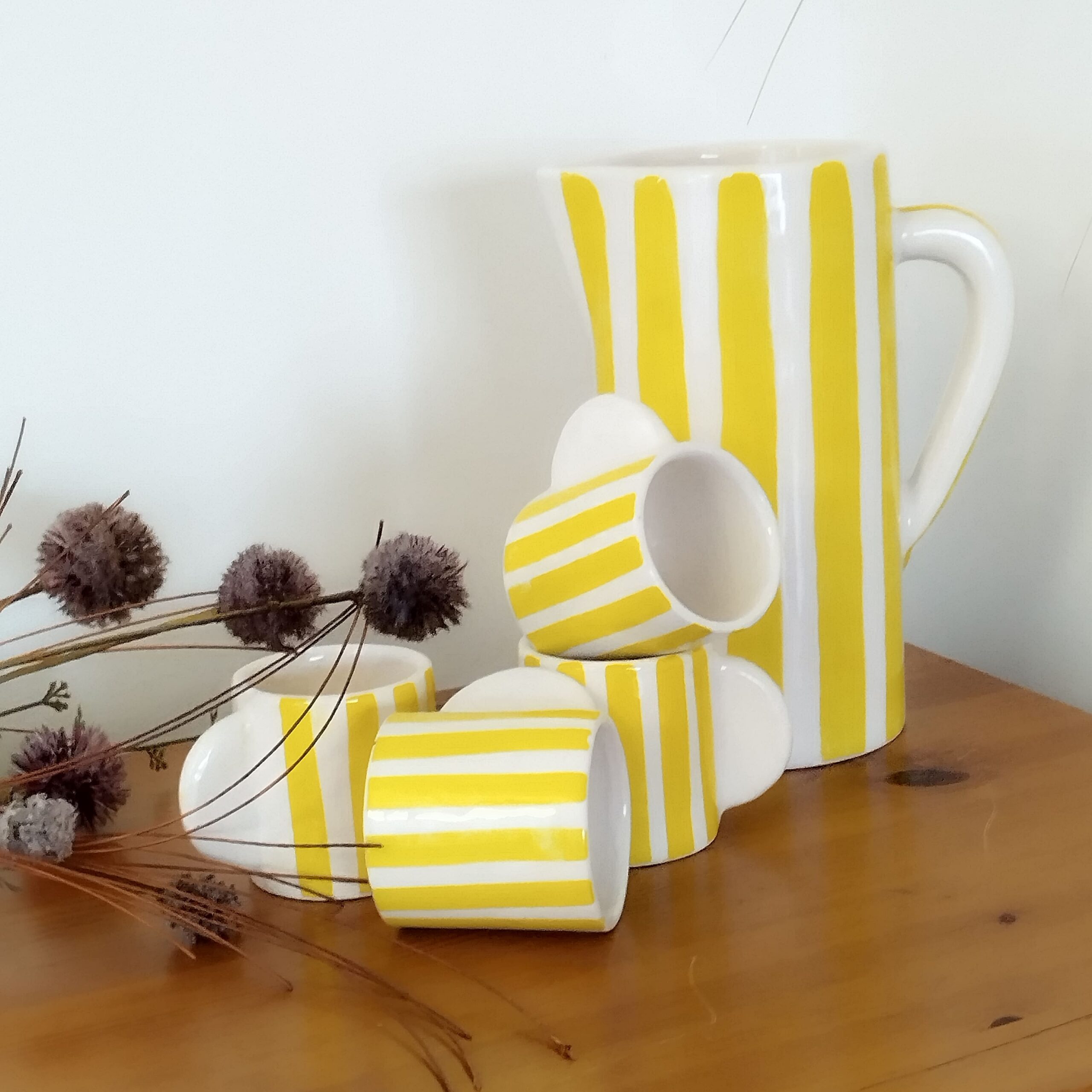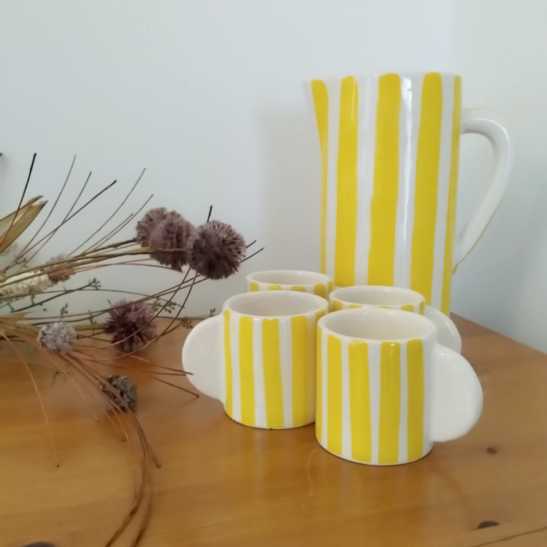 La carafe rayée jaune et blanc est réalisée à la main, conçue en terre cuite puis émaillée traditionnellement, elle apporte de l'originalité à votre intérieur.